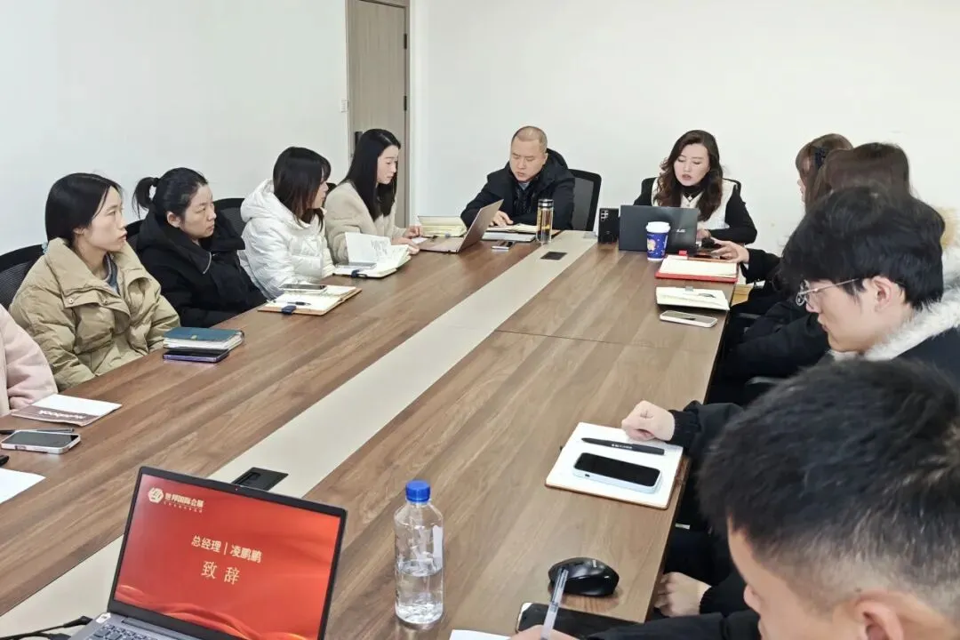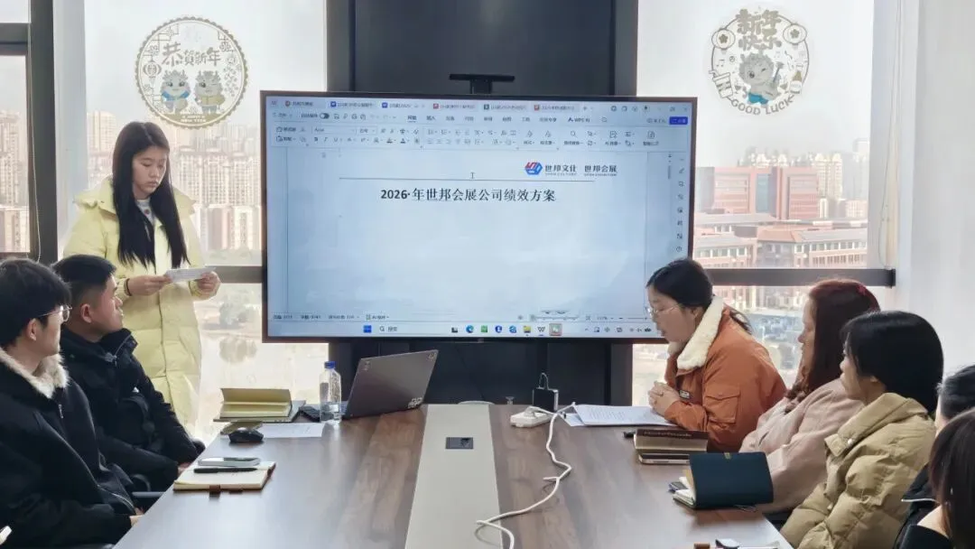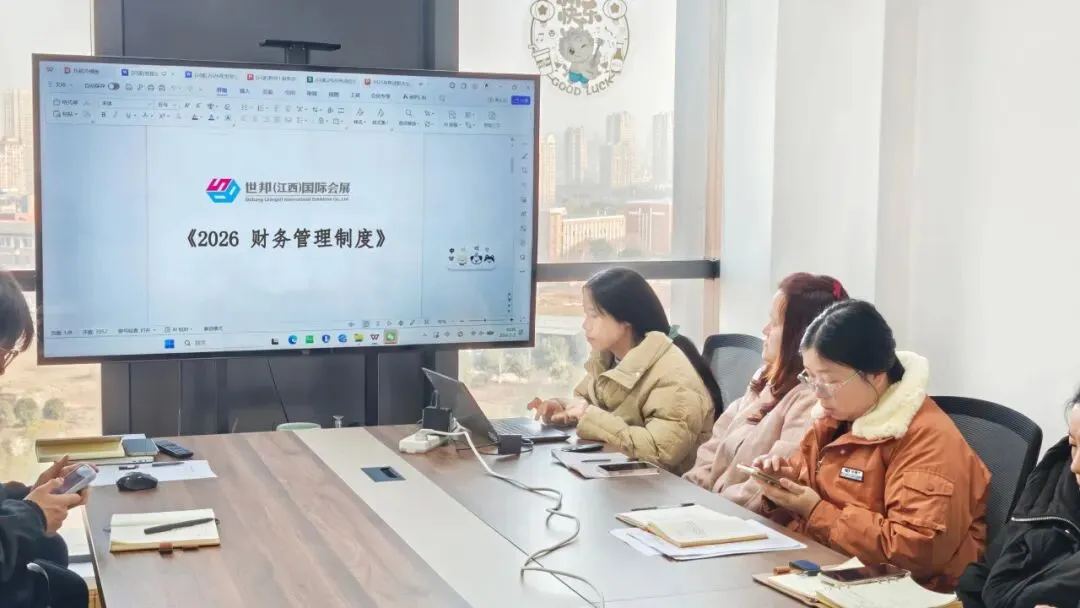 世邦(江西)国际会展总经理凌鹏鹏首先发表讲话,为本次大会奠定总基调,同时结合行业趋势对 2026 年的战略布局进行了展望。随后,行政部门负责人对《2026 年各岗位绩效方案》进行详细解读,财务部门负责人围绕最新的《2026 财务管理制度》展开宣导,为新一年的管理体系明确标准。