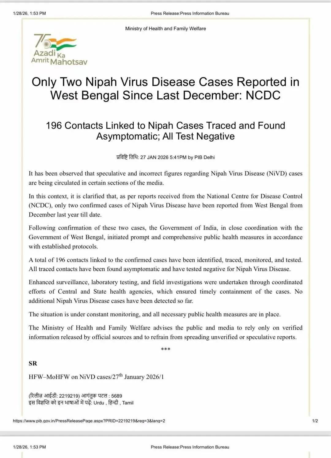 自 2025 年 12 月至今,印度仅在西孟加拉邦报告了 2 例尼帕病毒确诊病例。