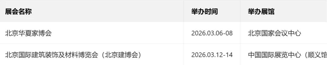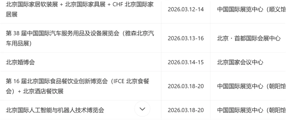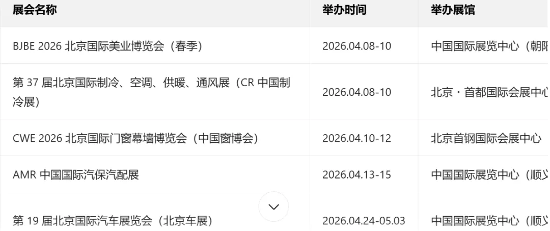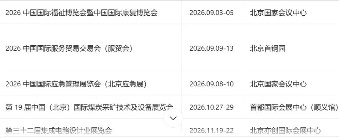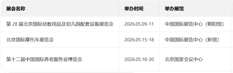 中国国际展览中心(朝阳馆):消费类展集中(美博会、礼品展),交通便利,靠近市中心;北京国家会议中心:科技、医疗类展优选(氢能展、养老展),会议 + 展览联动能力强;北京首钢园:服贸会永久会址,工业遗存风格,文商旅体融合场景丰富。入场提示:部分展会(如婚博会、家博会)采取实名制,需提前在官方公众号登记,携带「电子票 + 身份证」入场。排期变动:建议参展 / 观展前 1-2 周查询展会官网,确认最终时间、展馆及新增同期活动。整理自全网公开资料 方便参展商规划行程、观展者锁定目标!(最终排期以展会官网 / 展馆通知为准)