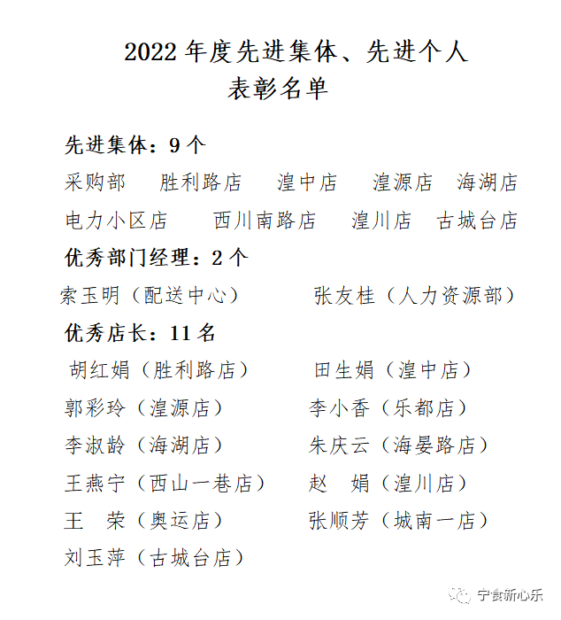 2023年4月21日上午,公司组织召开了2022年度工作总结暨表彰大会,集团公司党委委员、恒御新城房地产公司常务副总经理窦相龙先生、集团公司党委委员、办公室主任王东先生、宁食新心乐总经理李兵先生、各门店店长、受表彰人员及机关全体员工参会。