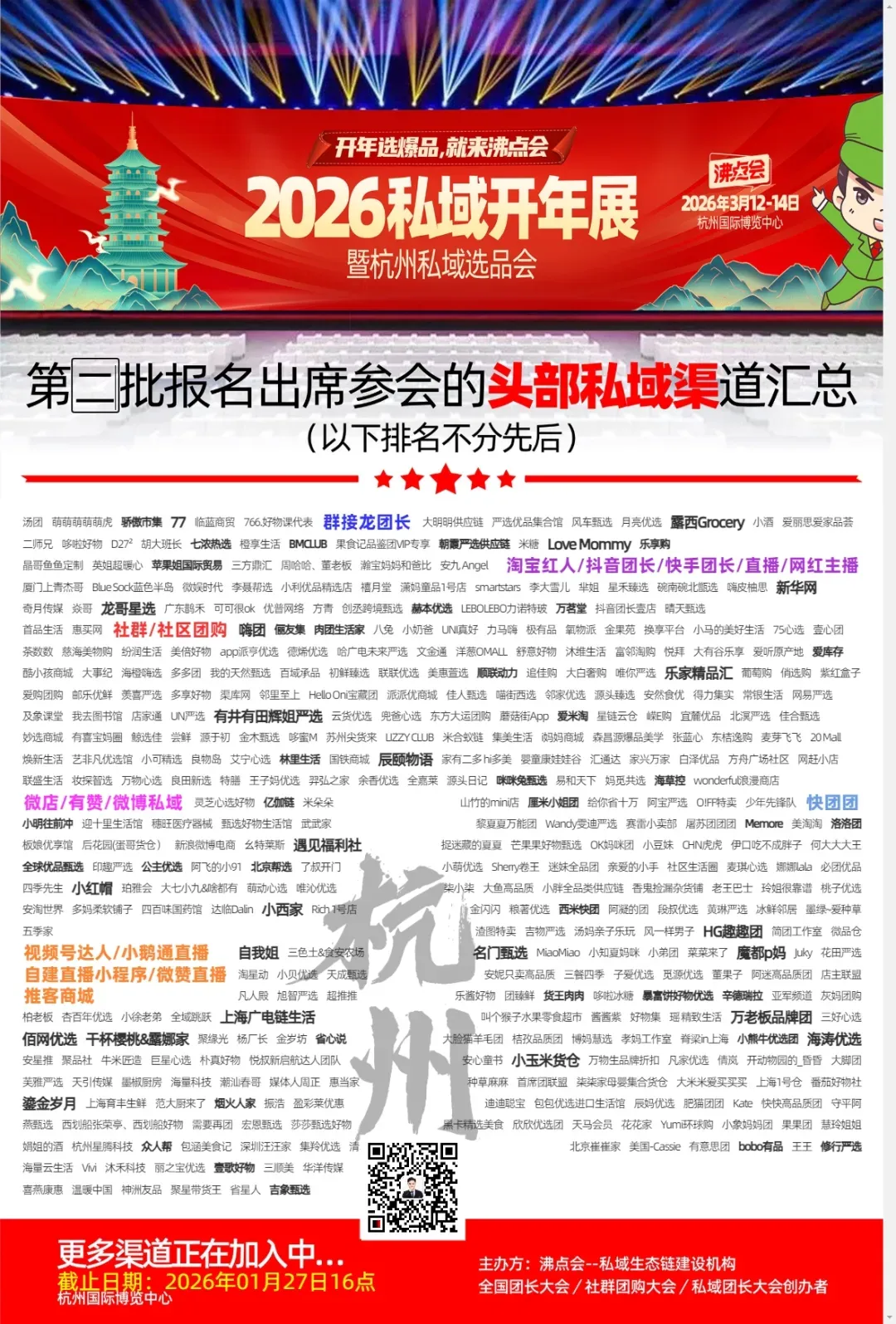 目前展位仅剩20%,如果你还没预定的话,建议抓紧时间做决定。毕竟开年的第一波商机,谁也不愿意错过。三月杭州私域渠道大会,期待与各位私域老朋友新面孔见面,一起聊聊2026年的私域该怎么玩。