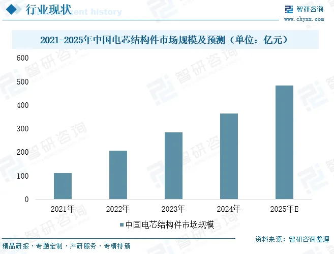 电芯结构件作为电池的“骨架”与“安全铠甲”,是为电池提供机械支撑、能量传输、电解液密封的核心安全件,主要包括壳体、盖板及防爆阀等。近年来,在新能源汽车渗透率持续提升及储能市场爆发的双重驱动下,电芯结构件行业规模迅速扩张。数据显示,2024年中国电芯结构件市场规模已达362亿元,预计2025年将增至482亿元,展现出强劲的增长势头。