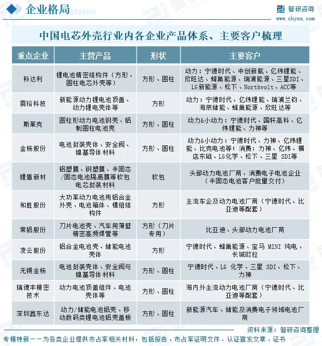 中国电芯外壳行业重点企业产品布局呈现全品类覆盖与细分赛道聚焦并行的特征,科达利以方形、圆柱电芯外壳等全品类精密结构件为主,深度配套宁德时代、LG新能源等全球头部厂商;震裕科技、常铝股份聚焦方形壳体及刀片电池壳细分领域,重点服务宁德时代、比亚迪等核心客户;斯莱克、无锡金杨主打圆柱型电池壳与封装部件,适配动力及消费电子多场景需求;锂盾新材专攻软包电芯核心的铝塑膜及固态电池隔离膜,已实现半固态电池专用材料批量交付;和胜股份、凌云股份侧重铝合金外壳与一体化电池箱体,凌云股份更凭借高端技术配套保时捷、宝马等国际车企;瑞德丰精密、深圳鑫东达则以顶盖组件、定制化铝壳为核心,覆盖动力、储能及消费电子多领域客户,形成差异化竞争格局。