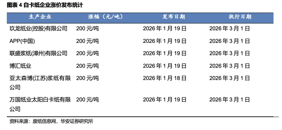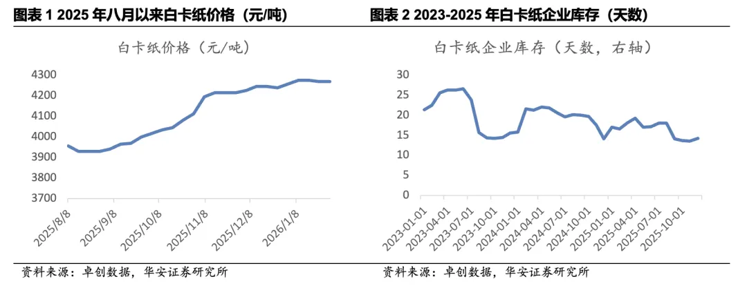 本文内容节选自华安证券研究所已发布报告:《行业周报:白卡纸企业持续提价,行业利润稳步修复》(发布时间:20260202),具体分析内容请详见报告。若因对报告的摘编等产生歧义,应以报告发布当日的完整内容为准。