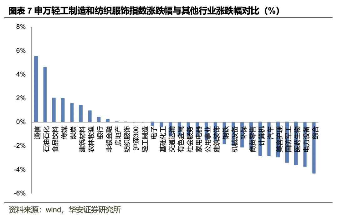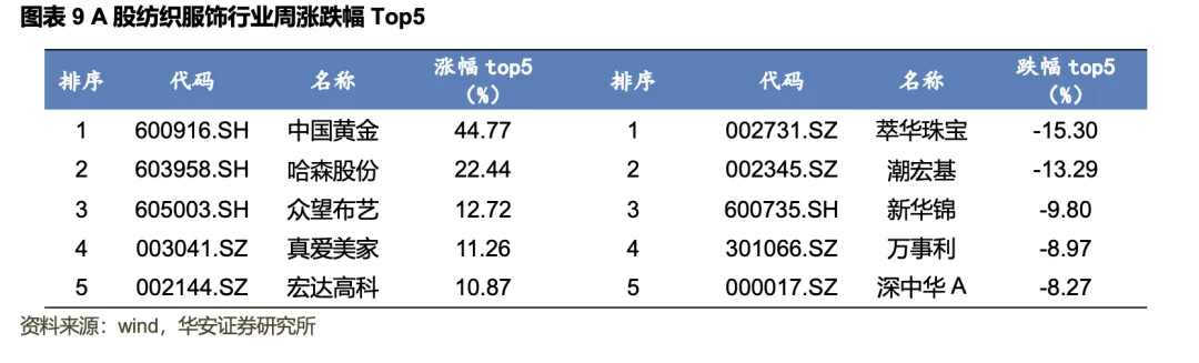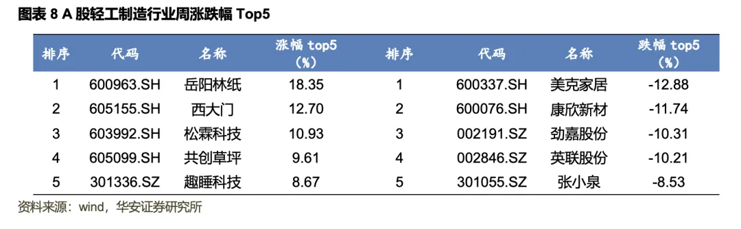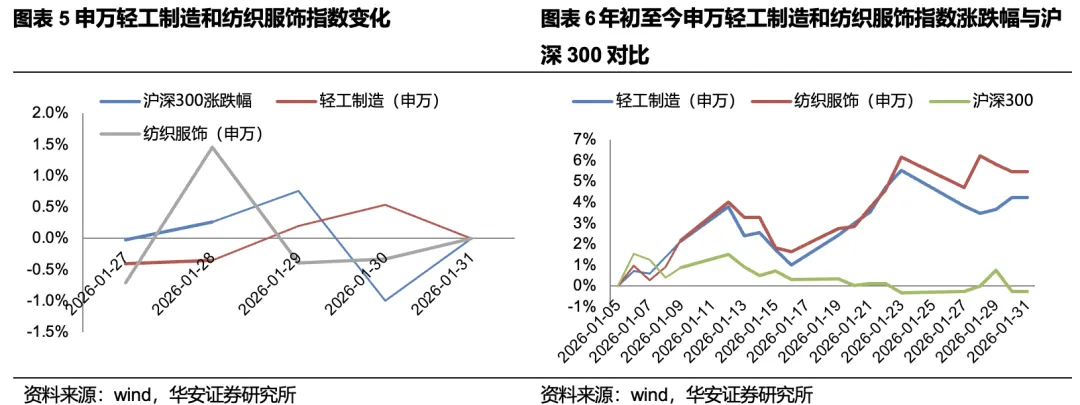 2026年1月27日至1月31日,上证综指下跌0.35%,深证成指下跌0.77%,创业板指上涨0.82%。分行业来看,申万轻工制造下跌0.02%,相较沪深300指数-0.01pct,在31个申万一级行业指数中排名12;申万纺织服饰上涨0.01%,相较沪深300指数+0.03pct,在31个申万一级行业指数中排名11。轻工制造行业一周涨幅前十分别为岳阳林纸(+18.35%)、西大门(+12.7%)、松霖科技(+10.93%)、共创草坪(+9.61%)、趣睡科技(+8.67%)、箭牌家居(+7.83%)、欧派家居(+7.63%)、金陵体育(+7.37%)、好莱客(+6.9%)、恒丰纸业(+6.72%),跌幅前十分别为美克家居(-12.88%)、康欣新材(-11.74%)、劲嘉股份(-10.31%)、英联股份(-10.21%)、张小泉(-8.53%)、梦天家居(-7.87%)、新宏泽(-7.71%)、齐心集团(-7.58%)、王子新材(-6.73%)、高乐股份(-6.36%)。纺织服饰行业一周涨幅前十分别为中国黄金(+44.77%)、哈森股份(+22.44%)、众望布艺(+12.72%)、真爱美家(+11.26%)、宏达高科(+10.87%)、歌力思(+10.06%)、浙文影业(+9.73%)、奥康国际(+9.5%)、迪阿股份(+5.89%)、罗莱生活(+5.03%),跌幅前十分别为萃华珠宝(-15.3%)、潮宏基(-13.29%)、新华锦(-9.8%)、万事利(-8.97%)、深中华A(-8.27%)、联发股份(-7.57%)、万里马(-6.98%)、*ST天创(-6.69%)、朗姿股份(-6.36%)、酷特智能(-6.2%)。