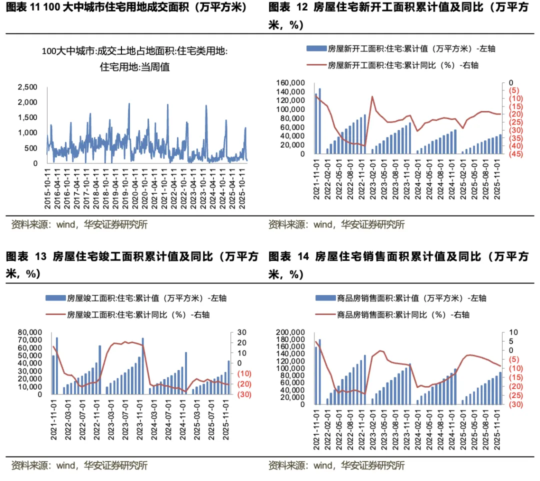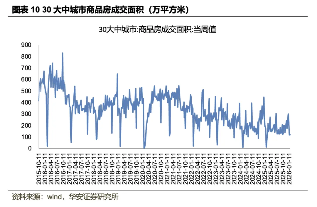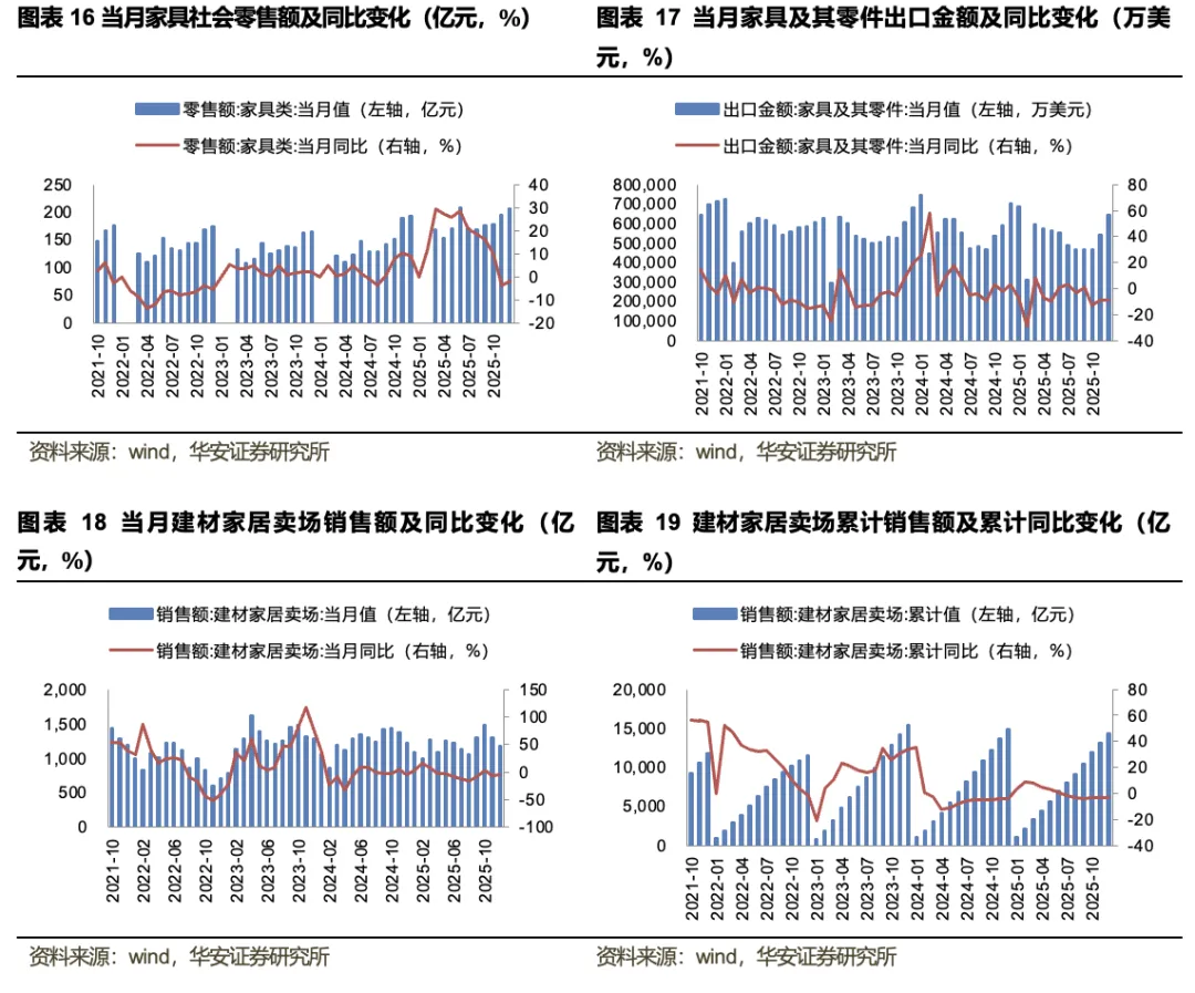 家居数据跟踪: 1)地产数据:2026年1月18日至1月25日,全国30大中城市商品房成交面积121.1万平方米,环比-6.37%;100大中城市住宅成交土地面积89.37万平方米,环比6.01%。2025年全年,住宅新开工面积4.3亿平方米,累计同比-19.8%;住宅竣工面积4.28亿平方米,累计同比-20.2%;商品房销售面积8.81亿平方米,累计同比-8.7%。2)原材料数据:截至2026年1月30日,软体家居上游TDI现货价为14250元/吨,周环比2.15%;MDI现货价为13950元/吨,周环比-0.36%。3)销售数据:2025年12月,家具销售额为207.3亿元,同比-2.2%;当月家具及其零件出口金额为644954.1万美元,同比-8.6%;建材家居卖场销售额为1179.6亿元,同比-4.4%。