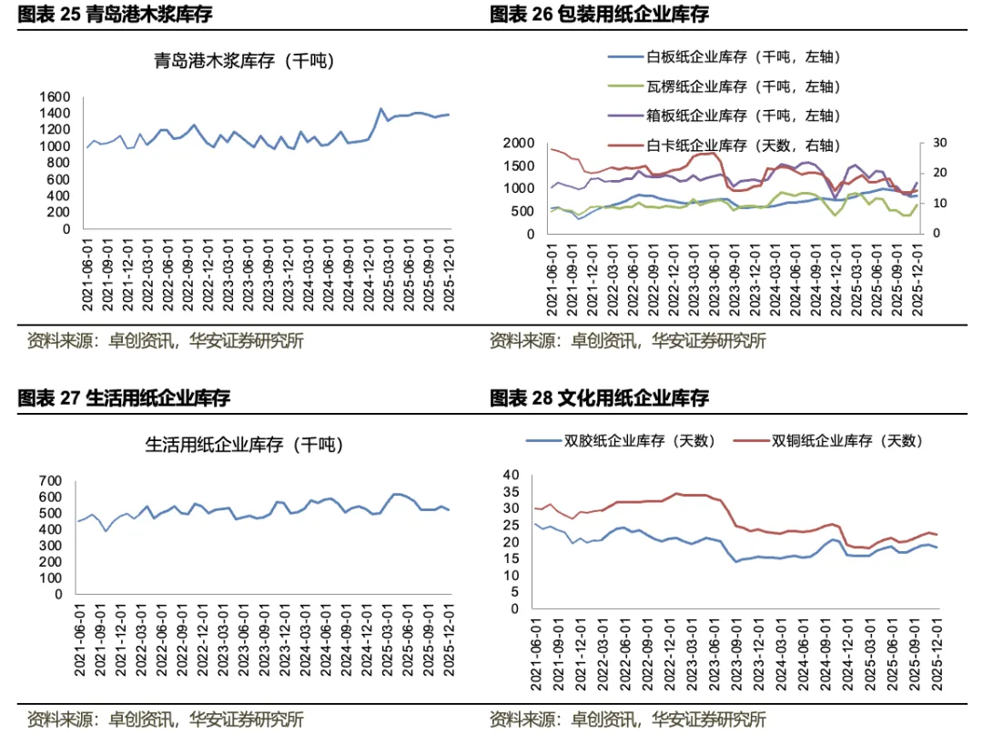 其次,供给端库存下降,推动供需平衡,有助价格恢复。2025年8月以来,白卡纸库存周期性下降,使市场供需呈现相对平衡的状态。厂家由于前期低价主动放缓生产节奏,带动企业库存和社会库存水平持续下降。同时,纸厂选择春节后涨价,可刺激下游客户加快采购节奏,消化库存。