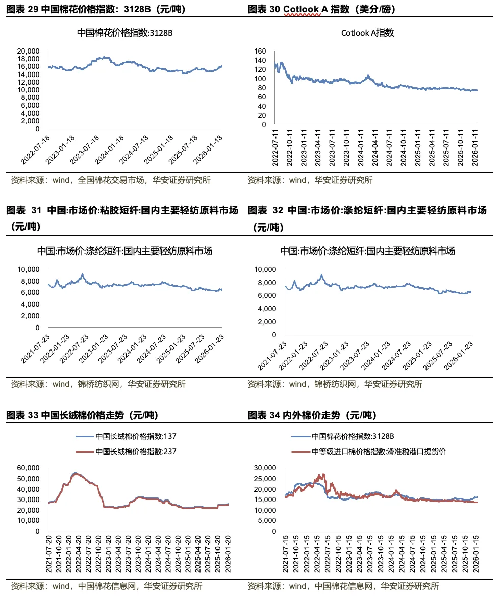 原材料:截至2026年1月30日,中国棉花价格指数:3128B为16183元/吨,周环比1.97%。截至2026年1月29日,Cotlook A指数为74.15美分/磅,周环比-0.54%。截至2026年1月23日,中国粘胶短纤市场价为12600元/吨,周环比0%;中国涤纶短纤市场价为6640元/吨,周环比+2.63%。截至2026年1月27日,中国长绒棉价格指数:137为25695元/吨,周环比+0.98%;中国长绒棉价格指数:237为24930元/吨,周环比+0.67%。截至2026年1月29日,内外棉差价为2439元/吨,周环比+13.18%。
