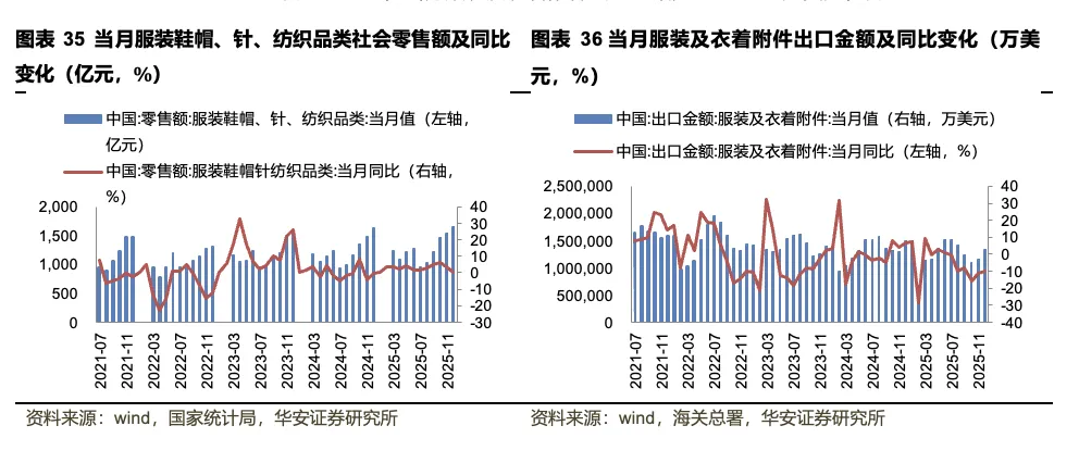 销售数据:2025年12月,当月服装鞋帽、针、纺织品类零售额为1661亿元,同比+0.6%;当月服装及衣着附件出口金额为1341241万美元,同比-10.2%。