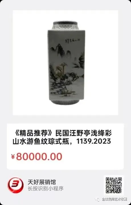 民国汪野亭浅绛彩山水游鱼纹琮式瓶,珠山八友四方瓶。民国时期珠山八友瓷器闻名全国。号称珠山八友实际有十人,分别是汪野亭,王琦,程意亭,何许人,王大凡,邓碧珊,毕伯涛,田鹤仙,徐仲南。他们成立了月圆会组织。此瓶由汪野亭画山水,王琦画人物,邓碧珊画鱼,田鹤仙画梅花,这些都他们最擅长的画技,也是他们的最高水平,也是他们的代表作。底款是月圆会。从表面可见哈琍光。近百年瓷器有老化现象。尺寸高32口经13底径18。2023 年 11月 1曰,经天好评审团评审,以6票优势荣登精品榜,获第104期天好海选精品。来源1139。V.
