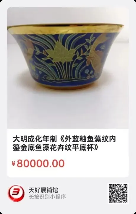 大明成化年制《外蓝釉鱼藻纹内鎏金底鱼藻花卉纹平底杯》,高4.2㎝,口径8.3㎝,底径4.7㎝。简介:上述成化年制五彩内外鱼藻图纹平底杯,内壁满鎏金,外口、底沿鎏金,鱼藻花卉纹生动活泼,口杯外壁深蓝色釉,衬托描金图纹,荷塘夜色,绘画精彩绝伦,鱼儿翻腾喜庆,象征福寿有餘!此瓷器工艺精湛,凝重灵巧,是当年宫廷把玩饮茶酒的宝物。来源1510.V。