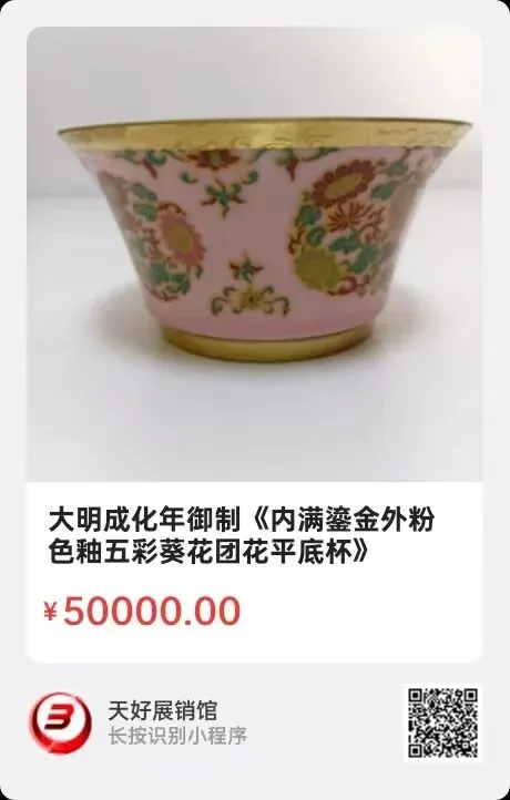大明成化年御制《内满鎏金外粉色釉五彩葵花团花平底杯》,高4.2㎝,口径8.1㎝,底径4.8㎝。简介:此平底口杯是公元1465年,大明宪宗皇帝登基隆庆上品佳器,宫廷御制(杯底粉色釉地金字落款)。胎体轻盈,色彩和谐,淡雅,杯体精美小巧,是成化小型瓷器的精华。来源1510.V。