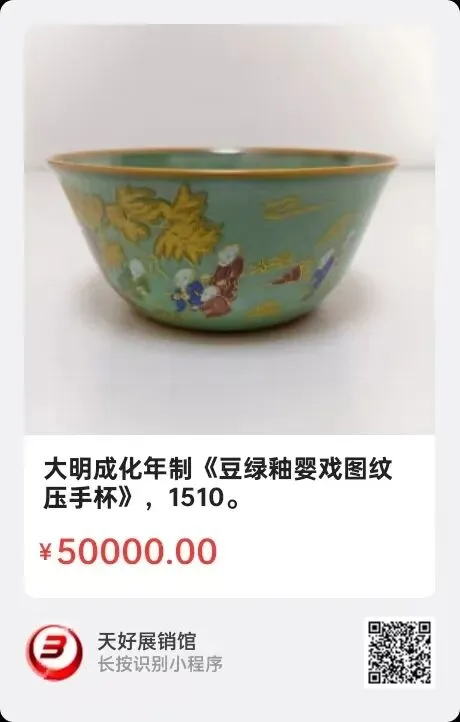 大明成化年制《豆绿釉婴戏图纹压手杯》,高3.9㎝,口径8.4㎝,平底径3.9㎝。简介:此压手杯是成化年制官窑瓷器,杯内外施豆绿色釉,外绘一群小和尚水边滩桥边戏闹玩耍图纹,生动活泼可爱!釉色浓郁素雅,描金黄色口沿,底彩绘花卉边,内圈楷字:大明成化年制。以上压手杯是宫廷用工艺精湛,设计优美的秀珍生活用品,十分稀有。来源1510.V。