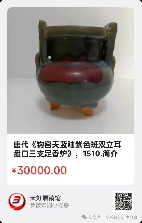 唐代《钧窑天蓝釉紫色斑双立耳盘口三支足香炉》,高13.3㎝,口径9㎝,三足距6㎝,横宽12.3㎝。简介:唐代晚期已有钧窑窑变陶瓷烧造,陶瓷偏陶性,天蓝釉色浓郁,彰显了礼器的艺术价值。此件为民间所用,工艺优美,具有较髙的历史文化价值。来源1510.V.