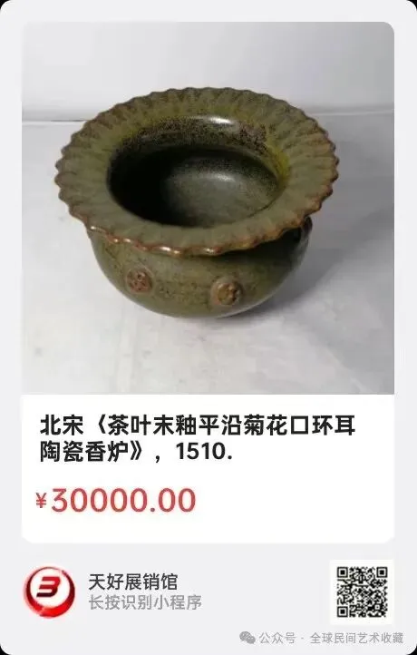 北宋〈茶叶末釉平沿菊花口环耳陶瓷香炉》,高9.7㎝,沿口15.4㎝,圈足7.5㎝。简介:此北宋时期茶叶末釉官窑平底香炉,平沿菊花口,内外施釉,炉围有圆形浮雕,双环耳,炉体稳重高雅,做为人们祈福,祭祀用的礼器,尤显肃穆得体。来源1510.V.
