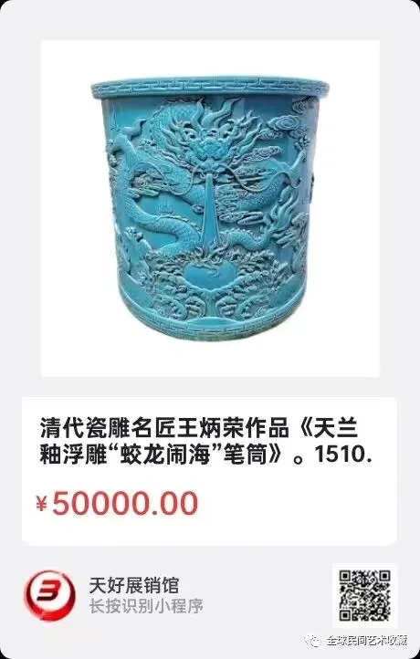 清代瓷雕名匠王炳荣作品《天兰釉浮雕“蛟龙闹海”笔筒》。高21.5㎝,口径19㎝,底径20㎝。来源1510.V.