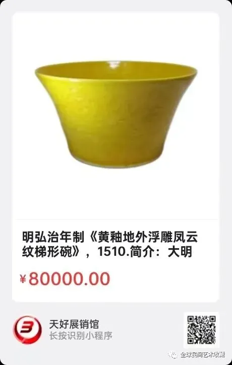 明弘治年制《黄釉地外浮雕凤云纹梯形碗》,高8.5㎝,口径16㎝,底径8.8㎝。简介:大明弘治时期黄釉瓷器为著名品种。釉色娇嫩淡雅,如“鸡油”一般细腻,此时期黄釉瓷釉面光亮,颜色深。此碗梯形,外刻划凤雲纹,圈足底书写“大明弘治年制”六字楷书。此瓷器优美大气,具很高的艺术观赏价值。来源1510.V.