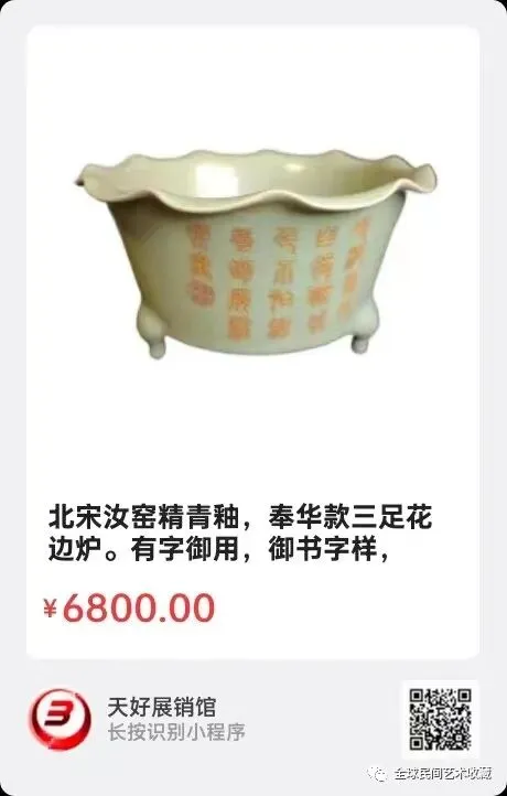北宋汝窑精青釉,奉华款三足花边炉。高10厘米,口径19厘米,底径13厘米。有字御用,御书字样,刻诗文二篇。细纹开片,五支钉,釉面十分润滑。无疑是北宋汝窑精品。保真,一月内无理由退款退货。来源:0456。V。