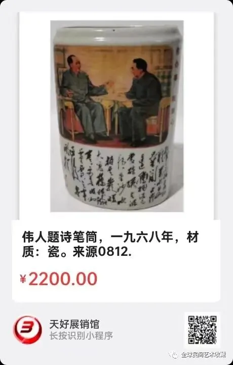 瓷笔筒。筒身为伟人戴帽图像,像下为诗词,背面为伟人手书"钟山风雨起苍茫……"诗词一首。底部半圆形书"敬祝伟人万寿无疆,江西省革委会、江西省军分区、1968年"字。筒高12.4公分,口径5.6公分,底径8.4公分。来源1169.