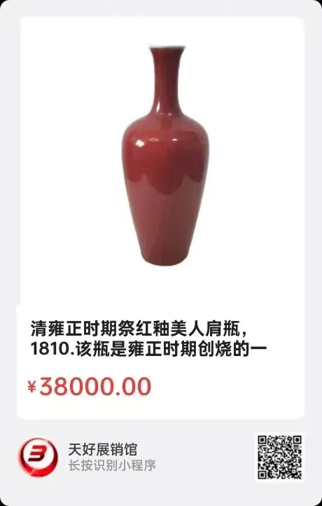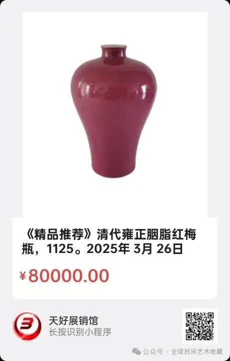 清代雍正胭脂红梅瓶,胭脂红是一种以金为呈色剂的低温釉彩,釉色如胭脂般浓艳柔润,深浅过渡自然,釉面光润如宝石,又有洋红或金红之称,是吸收西方珐琅彩制作工艺的成果。这枚雍正时期(1723一1735年)的胭脂红梅瓶,发色非常柔润艳丽,造型挺拔秀美,线条流畅,典型特征为小口、短颈、丰肩、弧腹渐收至底,其底是修胎为玉壁底,胎土紧密细致,底圈以青花书写双圈"大清雍正年制"六字楷书,字体工整秀丽有力,整个梅瓶优雅端庄,属官窑之珍品。尺寸:高23X肚径14X底是8.5Cm,2025年 3月 26日,经天好评审团评审,以6票优势荣登精品榜,获第164期天好海选精品。来源1125.V.
