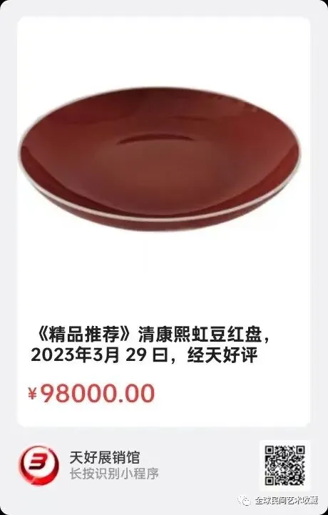 清康熙虹豆红盘,虹豆红是康熙时期的瓷器珍贵品种,又称美人醉,比喻发色象少女一样美艳,用铜红釉作料,吹烧高温制作方式,一般形成都有红色深浅不一戓有釉变青绿点出现,这个盘吹烧成全红而发色亮丽非常难得,值得珍藏。尺寸直径22x高4.5cm,2023年3月 29 曰,经天好评审团评审,以 6 票优势荣登精品榜,获第七十五期天好海选精品。来源:1125。V。