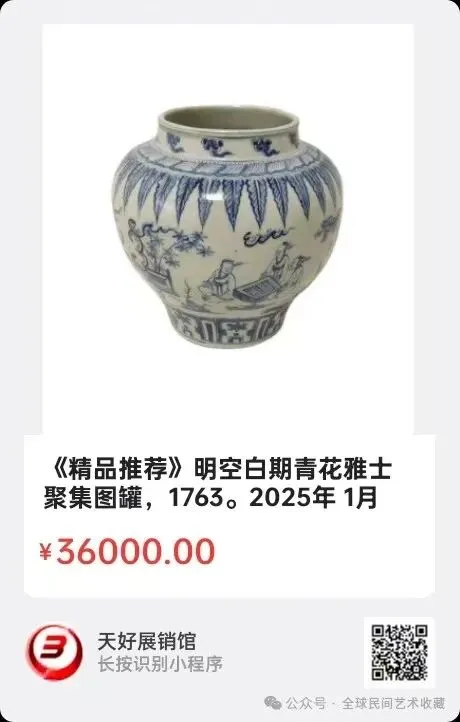 明空白期青花雅士聚集图罐,画风飘逸灵动,人物传神形象,釉质莹润自然,青花深入胎骨。藏品高21公分,口径13公分,底足15公分,2025年 1月 15日,经天好评审团评审,以7票优势荣登精品榜,获第159期天好海选精品。来源1763.V。