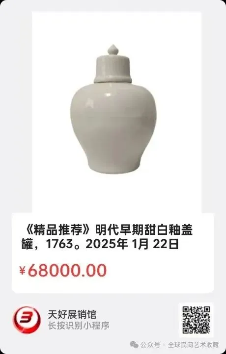 明代早期甜白釉盖罐,瓷釉层肥厚纯净、温润肥腴、柔和甜美;器物整体施白釉,仅在足端处无釉、足墙转折处釉色白中微微闪青泛黄,给人以一种“甜腻”的感觉。在显微镜下分析,甜白釉中存在大量固体微粒,大量小气泡会使入射光产生强烈散射,使釉显得更加乳浊,从而产生似玉非玉又胜玉之美感;藏品通高25公分,瓶口4公分,盖口7.5公分,底足10.5公分,2025年 1月 22日,经天好评审团评审,以7票优势荣登精品榜,获第160期天好海选精品。来源1763.V。