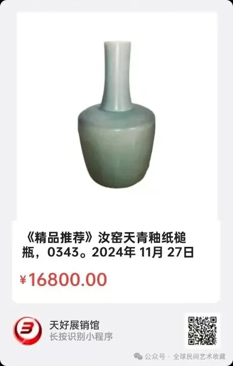 汝窑天青釉纸槌瓶,尺寸:高20.6公分,腹径10.8公分,口径4公分;简介:该器物的器形 ,釉色,器物的几何尺寸都有其年代的特征迹象 ,特别是釉面那种其它任何瓷系釉面都不可能有的明显的漂流感云☁️雾状的“汝窑碱”斑点痕迹;下面的图片纯属该器物的真实特征迹象痕迹,请老师们依据图片予以鉴评。谢谢!2024年 11月 27日,经天好评审团评审,以6票优势荣登精品榜,获第153期天好海选精品。来源0343.V.