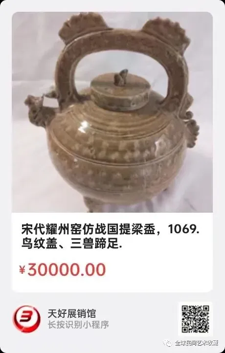 宋代耀州窑仿战国提梁盉,鸟纹盖、三兽蹄足,高:26㎝,口径:5、8㎝,腰径:18㎝,底径:12㎝。已经海选评审。来源1069.V.