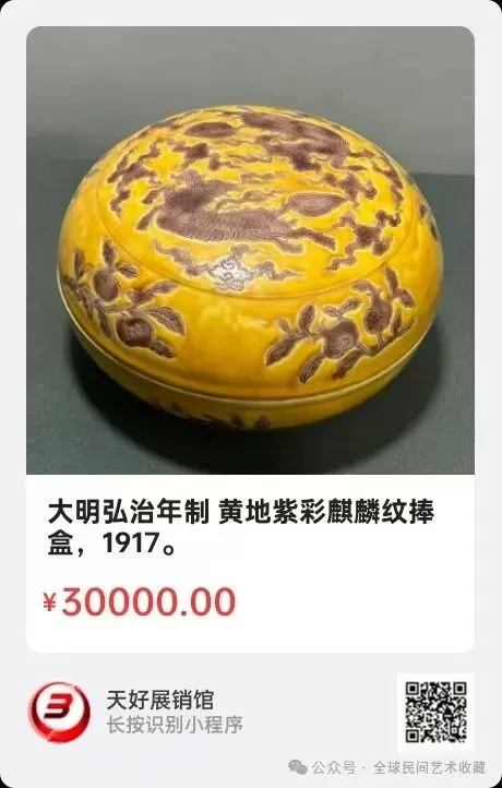 大明弘治年制 黄地紫彩麒麟纹捧盒,直径18公分,高10公分,来源1917。