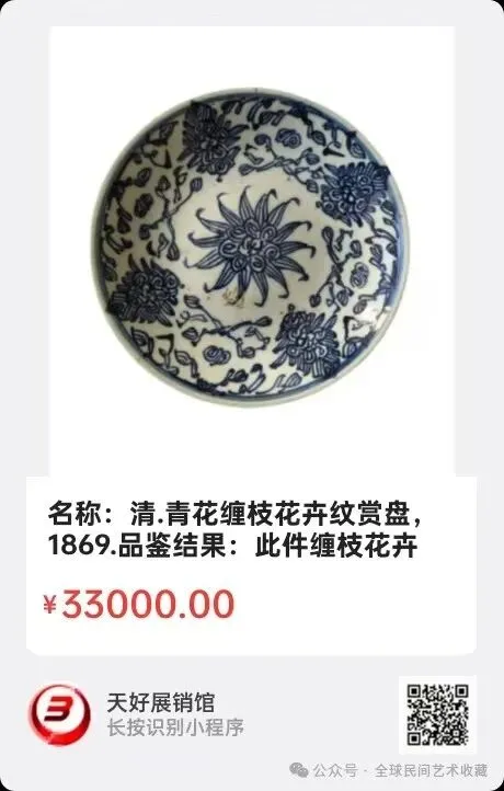 名称:清.青花缠枝花卉纹赏盘,规格:直径14.6cm 高3.0cm。品鉴结果:此件缠枝花卉纹赏盘为清代手工制瓷历史遗存,作品胎体敦厚,造型典雅,青花发色素雅,绘画流畅细腻,疏密有致,层次清晰,为清代青花瓷佳作,具有较高的艺术价值与历史价值。来源1869。