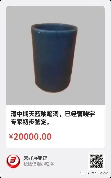 清期天蓝釉笔洞,高13.7公分,宽9.5公分,已经曹晓宇专家初步鉴定。来源:0122。