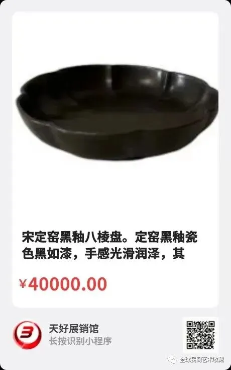 宋定窑黑釉八棱盘。高:3.8厘米,口径:17.5厘米,足径:11.4厘米。定窑黑釉瓷色黑如漆,手感光滑润泽,其釉面光可鉴人。黑定施釉有厚薄之分,釉成分中氧化铁含量较高,经高温还原后成了三氧化二铁,因而色泽钳黑。黑定物件的口沿因高温下釉流动快速而形成了一道不规则的酱口,透过酱口可见其胎的白色。黑定施釉多数不及底,底部均露胎之原色,强烈的色彩反差,给黑定增添了一种神秘的色彩。此盘棱口,盘内有筋,外呈莲瓣形,圈足,底有三个支钉。整器造型规整,黑釉透亮,清雅脱俗、色莹可爱。来源:0631。