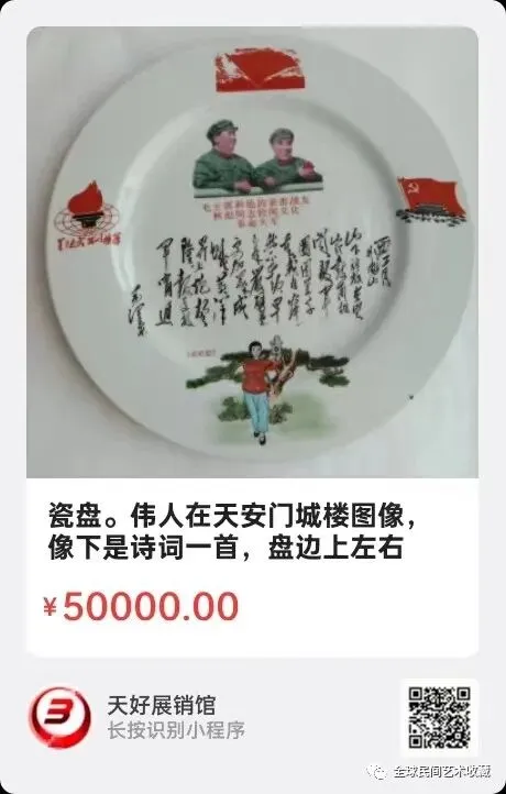 瓷盘。盘中是伟人在天安门城楼图像,像下是诗词一首,盘边上左右为红旗、火炬图案,盘边下是红灯记剧照。底款是敬祝伟人万寿无疆,省革委会、省军区,1968年。盘高2.4公分,直径26.5公分,底径16公分。来源1169.