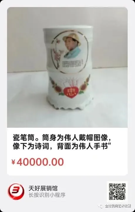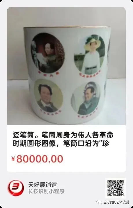 瓷笔筒。笔筒周身为伟人各革命时期圆形图像,笔筒口沿为"珍品珍藏,字号:18。笔筒底部半圆形字为"敬祝伟人万寿无疆",圆形下为"江西省革委会,江西省军分区,1968年″。笔筒高19.5公分,口经19.3公分,底径19。来源1169.