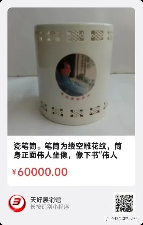 瓷笔筒。笔筒为缕空雕花纹,筒身正面伟人坐像,像下书"伟人在庐山",对背为伟人语录。底部为一红五角星,下书1968年制"。筒高11.8公分,口径10公分,底径10公分。来源1169.