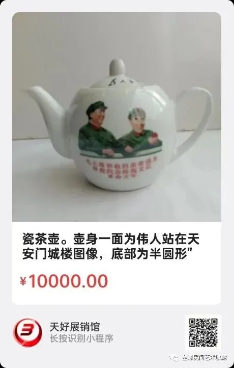 瓷茶壶。壶身一面为伟人站在天安门城楼图像,底部为半圆形"敬祝伟人万寿无疆,字下为"省革委会、省军区、一九六八年"。高14公,宽21公分,底径7公分。来源1169.
