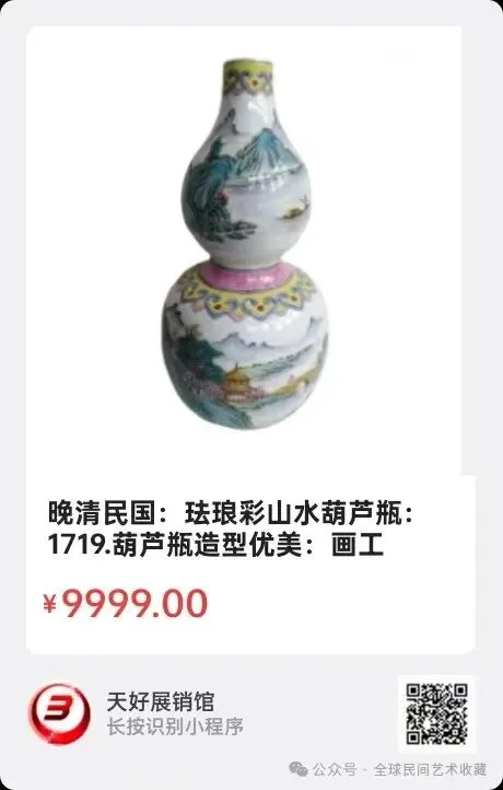 晚清民国:珐琅彩山水葫芦瓶:高23.5厘米:葫芦瓶造型优美:画工精细,彩色艳丽,瓷胎坚实,修足规范,印章款大清乾隆年制。包浆自然开门到代!全美品!极据收藏和观赏价值!来源1719.V.