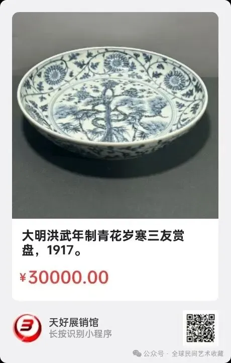 大明洪武年制青花岁寒三友赏盘,直径30公分,高7公分,来源1917。