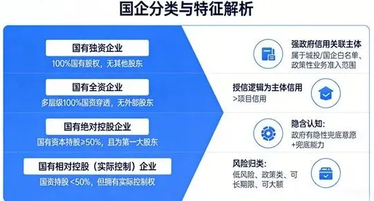 只有企业的第一大股东、实际控制人、控股股东为国资,才能被认定为国企主体。国企的子公司、孙公司、重孙公司为小比例参股的,不会被认定为国有信用主体;若违规把“间接参股”按国企授信,审批环节所有人员均会被追责,所以银行不敢、也不能把国资参股企业当国企对待。