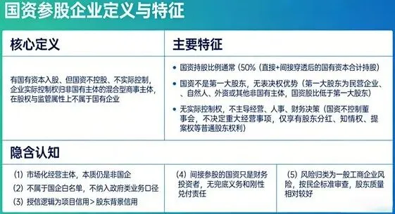 国资参股企业是指有国资入股但不控股、不实际控制企业,企业实际控制权归非国有主体的混合型商事主体,在股权与监管属性上不属于国有企业。
