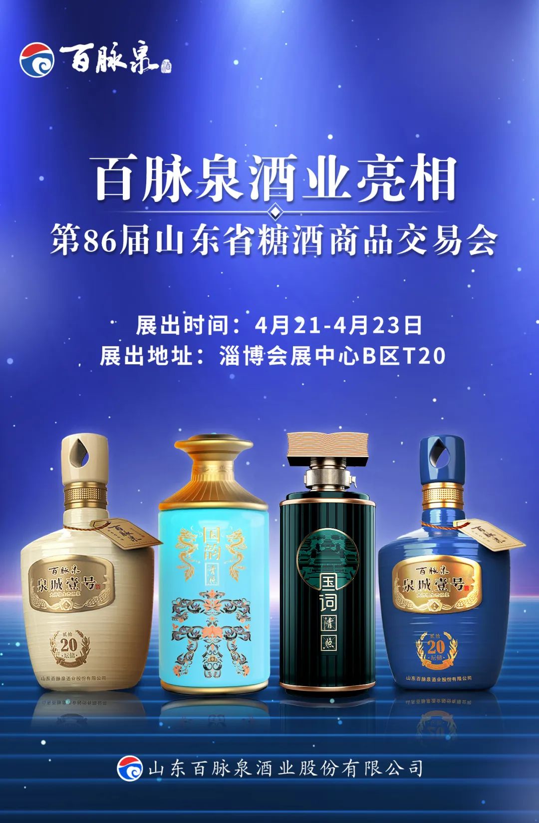 第86届山东省糖酒商品交易会将于4月21日在淄博会展中心开幕。山东百脉泉酒业股份有限公司诚挚相邀,与您相聚淄博!