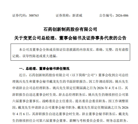 1月30日,新诺威发布变更公司总经理、董事会秘书及证券事务代表的公告:董事长姚兵申请辞去公司总经理职务,原董事会秘书、证券事务代表戴龙辞任,同时被聘任为公司总经理。