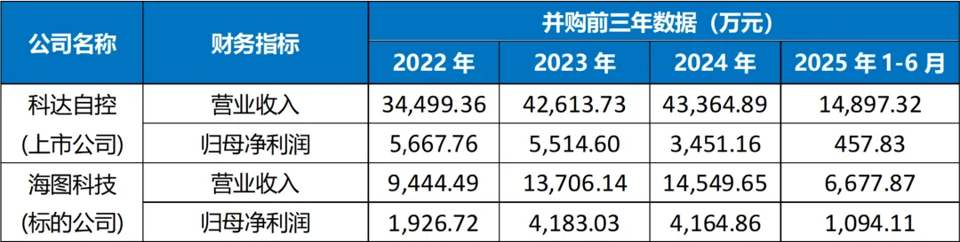 2022年以来,收购方科达自控营业收入呈现增长态势,归母净利润则有所下降。2024年科达自控营业收入增长率约为3.34%,归母净利润增长率约为-37.42%。2025年1-6月营业收入为14,897.32万元,归母净利润为457.83万元。