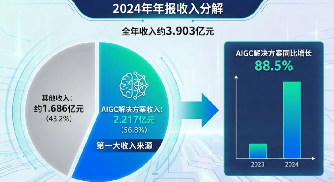 更重要的是,这个“第一大”不是靠短期偶然。公告披露其AIGC收入从2021年的680万元、2022年的3990万元、2023年的1.176亿元增长到2024年的2.217亿元,呈现连续爬坡