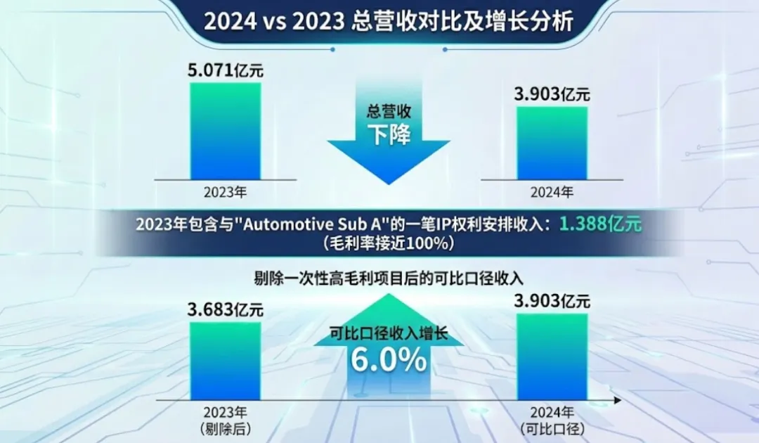 同时,公司提示一个对比口径:2023年包含与“Automotive Sub A”的一笔IP权利安排收入1.388亿元,该类收入毛利率接近100%。剔除这类一次性高毛利项目后,2024年与2023年的可比口径下,收入反而是增长6.0%(3.683亿到3.903亿)。
