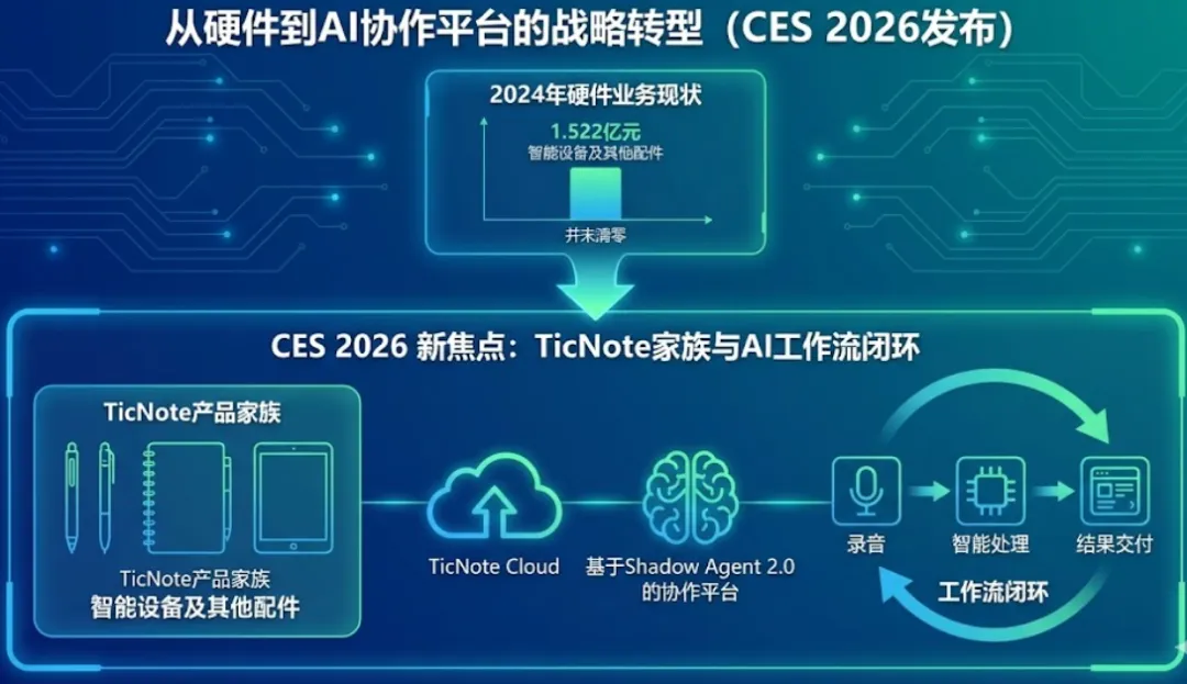 硬件业务并未清零。2024年“智能设备及其他配件”仍贡献约1.522亿元收入。但更值得关注的是,公司在CES 2026发布了TicNote产品家族,并同步推出“TicNote Cloud”以及基于Shadow Agent 2.0的协作平台能力,强调从“录音”走向“结果交付”的工作流闭环