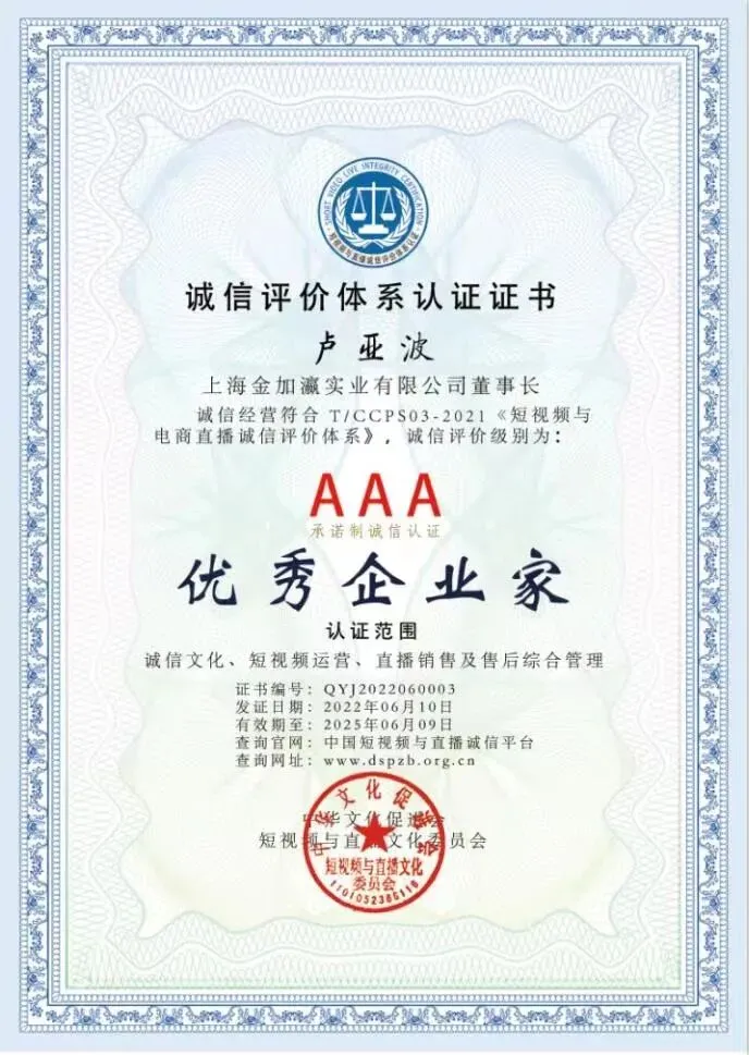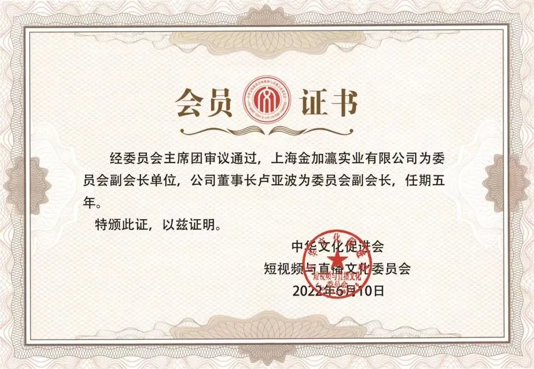 短视频与直播行业作为全新业态,在疫情肆虐的背景下对我国经济恢复发展发挥了重要作用,作为短视频与直播行业涌现出的一批优秀企业及个人,在短视频与直播诚信企业颁奖盛典上,上海金加瀛实业有限公司荣获“诚信品牌”,上海金加瀛实业有限公司董事长卢亚波荣获“优秀企业家”,在本次峰会被隆重表彰。与此同时,经委员会主席团审议通过,上海金加瀛实业有限公司为委员会副会长单位,公司董事长卢亚波为委员会副会长。
