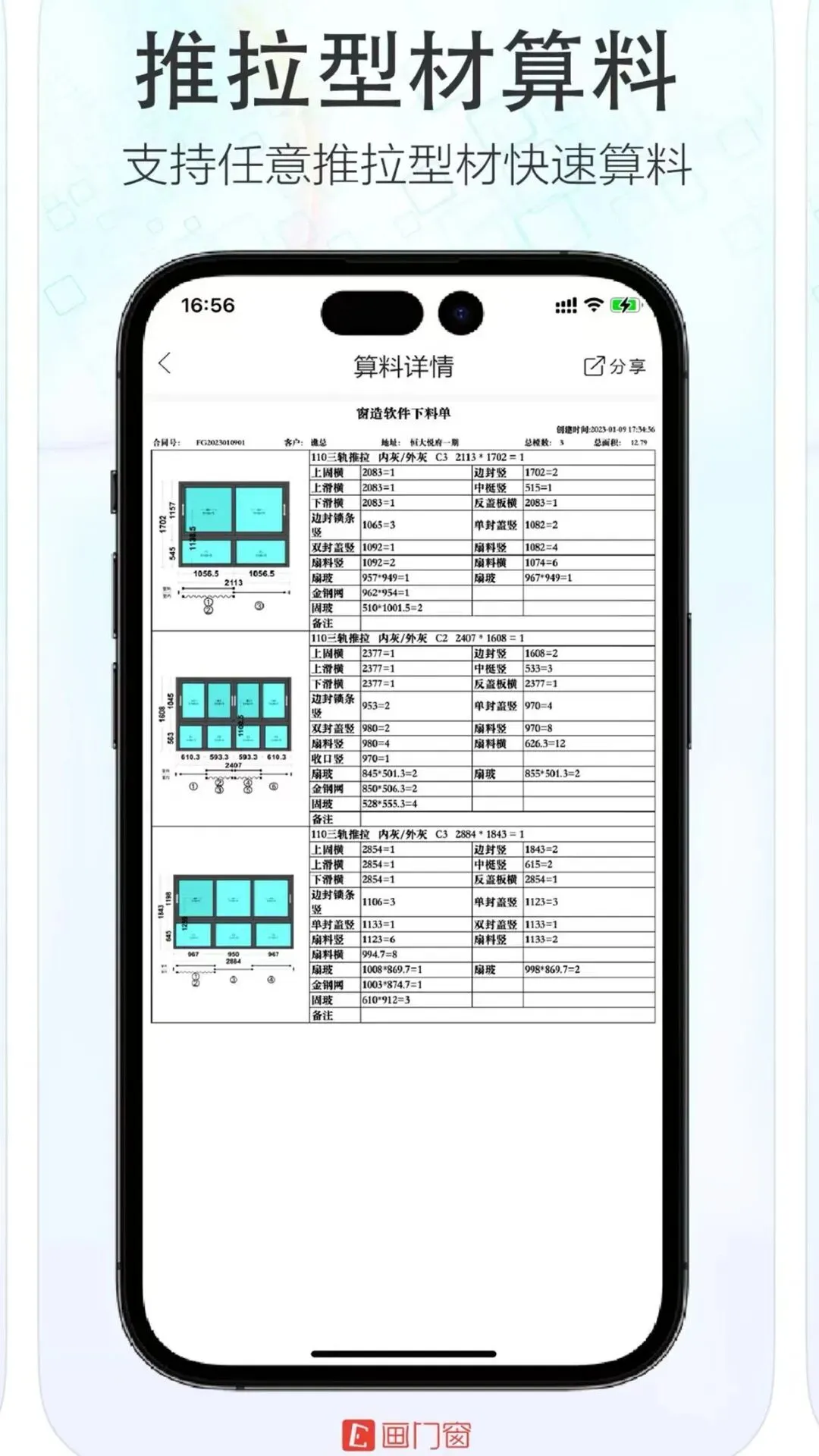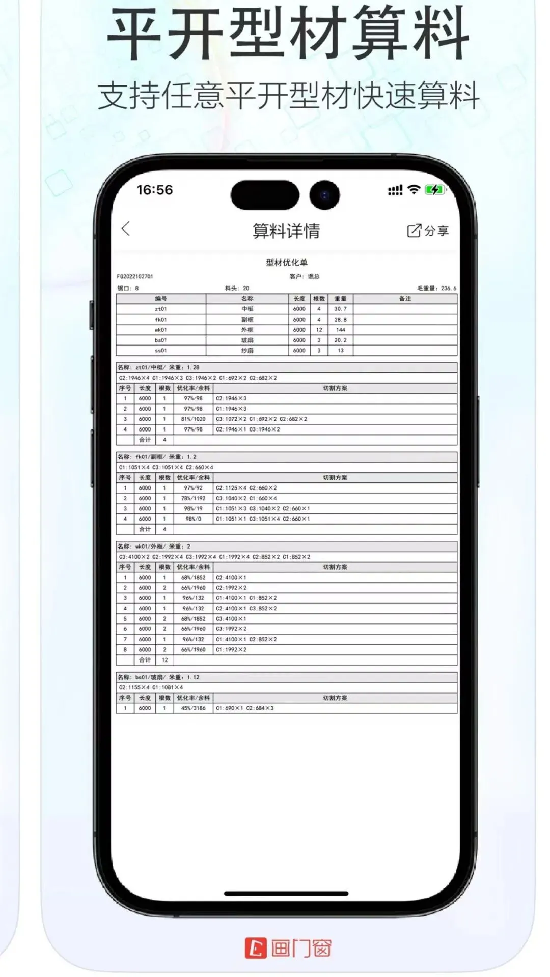 除此之外,我们根据门窗型材结构,设计了一套门窗人一看就懂的计算方法。可以直接在手机上把型材和玻璃计算出来(当然电脑也行),并实现型材优化。生成门窗下料单,玻璃生产单和型材优化单等。一个系列只需要做一个方案,软件自动识别任何窗型,包括异形门窗。