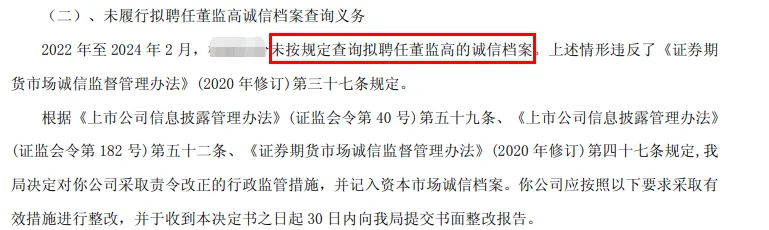 2025年L公司即因为未履行拟聘任董监高诚信档案查询义务而被辖区证监局责令整改。